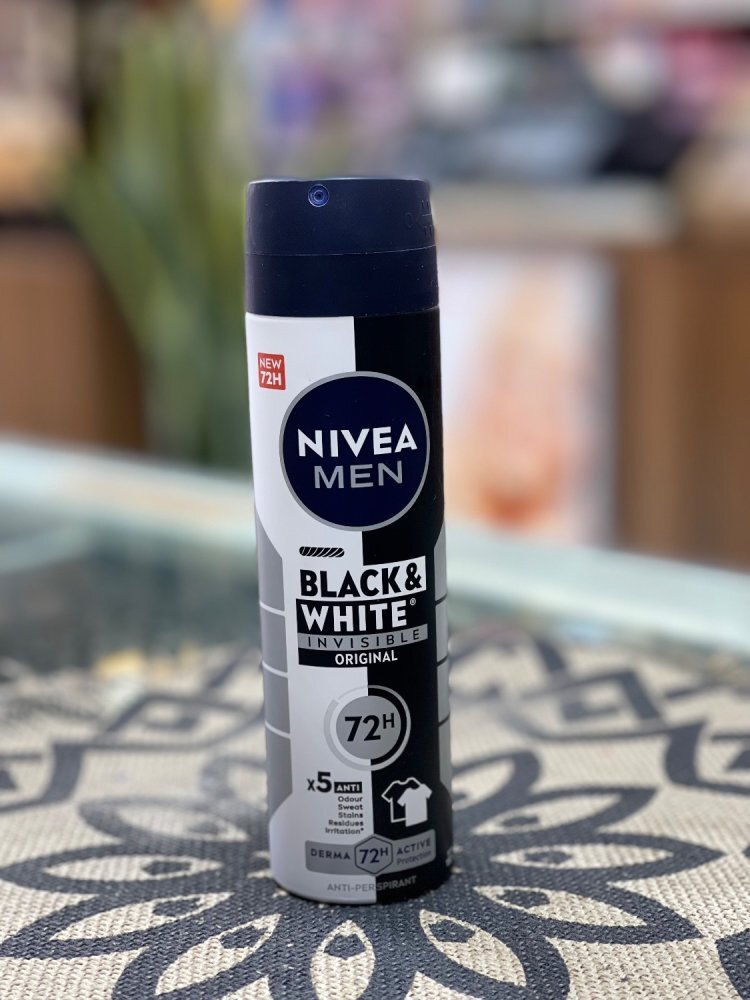 اسپری مردانه نیوآ بلک & وایت حجم ۱۵۰ میلیلیتر، با فرمول محافظ لباس، از ایجاد لک سفید روی لباسهای تیره و لک زرد روی لباسهای روشن جلوگیری میکند